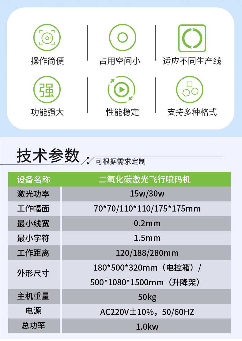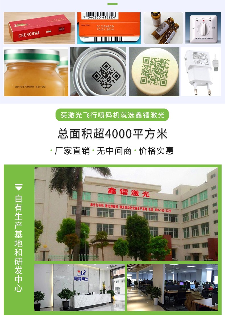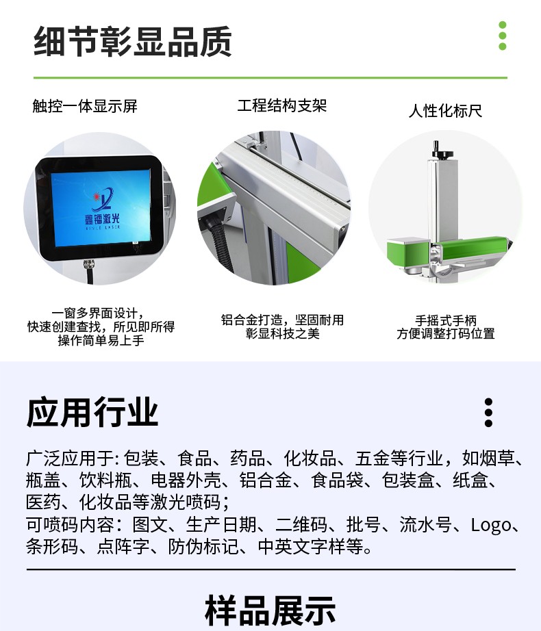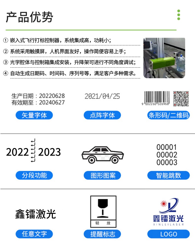 輕松適應不同生產(chǎn)線需求;支持超長打標和二維碼飛行打標;支持自動生成日期碼、時間碼、序列號等,廣泛應用在煙草、瓶蓋、飲料瓶、電器外殼、鋁合金、食品袋、包裝盒、紙盒、醫(yī)藥、化妝品等行業(yè);