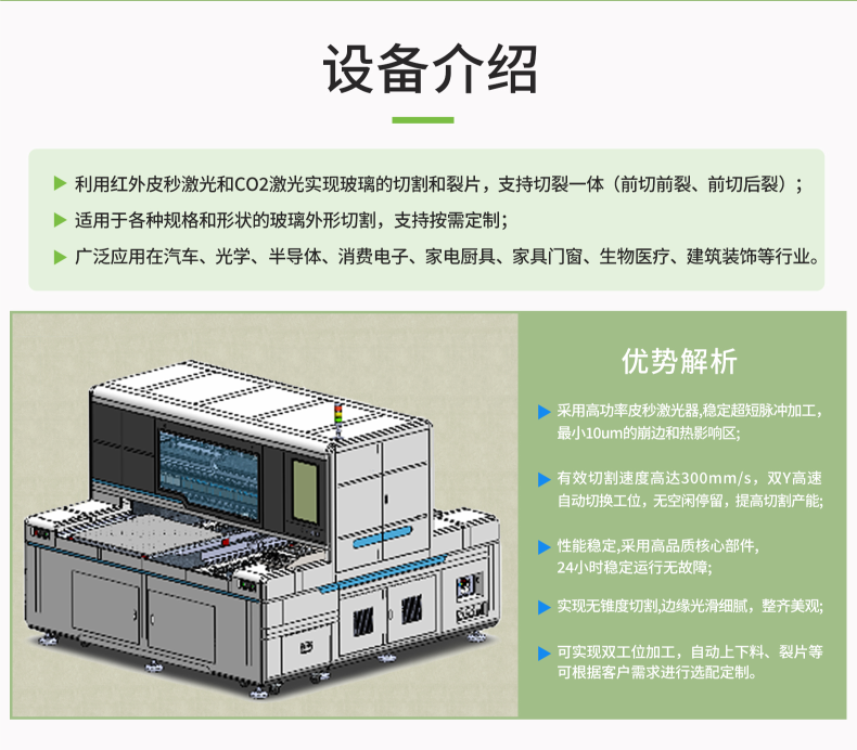 利用紅外皮秒激光和CO2激光實現(xiàn)玻璃的切割和裂片,支持切裂一體(前切前裂、前切后裂);