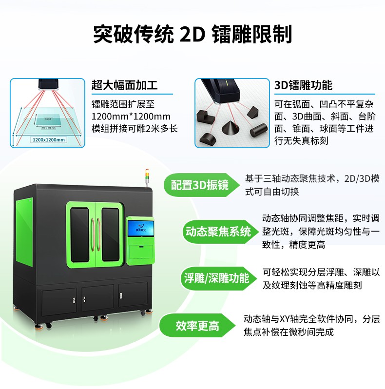 與傳統(tǒng)加工工藝如絲網(wǎng)印刷、熱壓成型、化學(xué)蝕刻等相比,3D大幅面激光鐳雕技術(shù)具有以下顯著優(yōu)勢(shì):