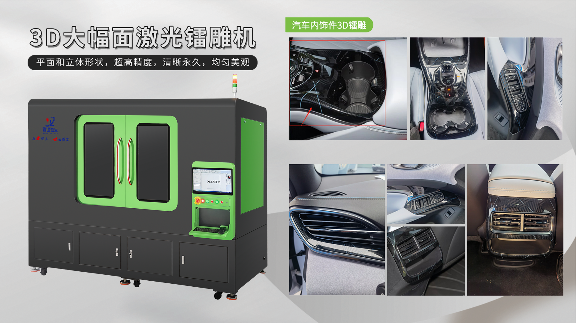2022年,東駿達公司與鑫鐳激光就汽車配件3D大幅面激光鐳雕項目展開了合作,汽車中控面板,門板裝飾件,出風(fēng)口,按鍵大幅面鐳雕,圖案清晰永久,線條優(yōu)美,色彩均勻,無拼接。