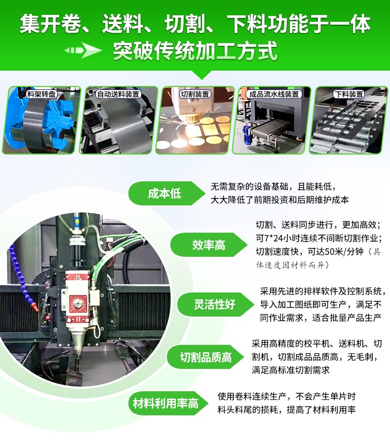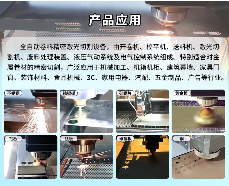 全自動(dòng)卷料精密激光切割設(shè)備,由開卷機(jī)、校平機(jī)、送料機(jī)、激光切割機(jī)、廢料處理裝置、液壓氣動(dòng)系統(tǒng)及電氣控制系統(tǒng)組成。特別適合對(duì)金屬卷材的精密切割,廣泛應(yīng)用于機(jī)械加工、機(jī)箱機(jī)柜、建筑幕墻、家具門窗、裝飾材料、食品機(jī)械、3C、家用電器、汽配、五金制品、廣告等行業(yè)。